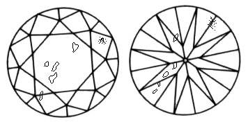 Si vous voyez sur le diagramme d'un certificat gemmologique d'un diamant SI2 (ou inférieur) aucune inclusion (ou très peu d'inclusions), cela doit attirer votre attention, cela indique généralement que ce ne sont pas les inclusions qui ont déterminé le degré de pureté de ce diamant mais son aspect laiteux.